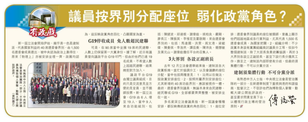 多名資深立法會議員指,新一屆議會種種安排,都反映傳統政黨的角色弱化:1、座位安排:選委會界別議員的座位被捆綁,意義上顯示他們超越地區或各行業利益,尤其代表1,500名選委會成員,為國家把關;2、組織分明:不少政黨本身設有黨團組織商討議員分工等,但如今整個建制派,除了大班長負責統籌協調,再於3大界別各設立正副班長,甚至下設行長分擔其工作。換言之,建制派內部即使有分歧,但最終須集體行動,不可以分黨分派。
