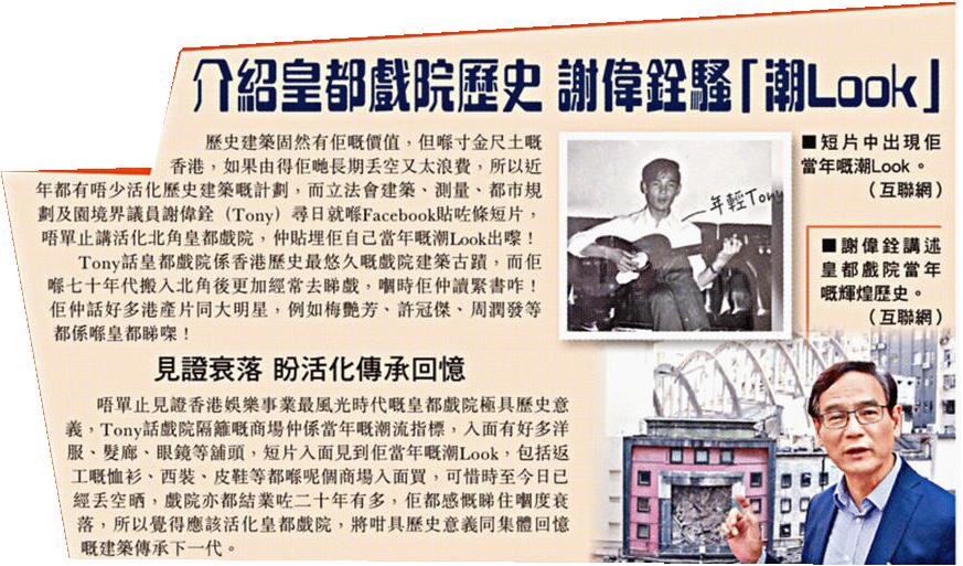 歷史建築固然有佢?價值,但喺寸金尺土?香港,如果由得佢哋長期丟空又太浪費,所以近年都有唔少活化歷史建築?計劃,而立法會建築、測量、都市規劃及園境界議員謝偉銓(Tony)尋日就喺Facebook貼咗條短片,唔單止講活化北角皇都戲院,仲貼埋佢自己當年潮Look出嚟!