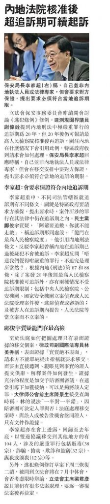 地刑法條文,反駁李家超曾稱內地在追訴期已過後疑犯不會被追訴。李家超反問「唔通我們覺得咁嚴重的罪行,不追究是理所當然?」根據內地《刑法》第87 和88條,除了案發20 年後經最高人民檢察院核准後可追訴外,亦有兩種情况不受追訴期限制:包括中央人民檢察院、公安機關、國家安全機關立案偵查或人民法院受理案件後,逃避偵查或審訴的;及被害人在追訴期內提告,人民法院等當立案而不立案的。