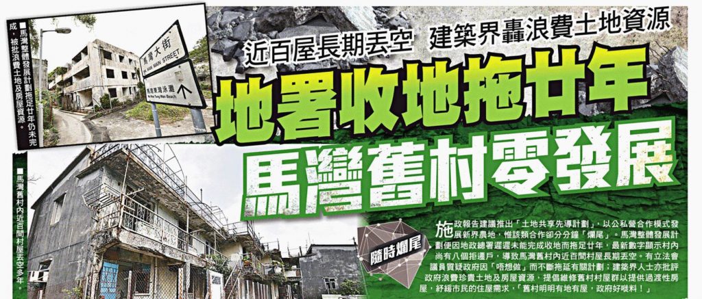 [:zh]施政報告建議推出「土地共享先導計劃」,以公私營合作模式發展新界農地,惟該類合作卻分分鐘「爛尾」。馬灣整體發展計劃便因地政總署遲遲未能完成收地而拖足廿年,最新數字顯示村內尚有八個拒遷戶,導致馬灣舊村內近百間村屋長期丟空。有立法會議員質疑政府因「唔想做」而不斷拖延有關計劃;建築界人士亦批評政府浪費珍貴土地及房屋資源,提倡維修舊村村屋群以提供過渡性房屋,紓緩市民的住屋需求,「舊村明明有地有屋,政府好嘥料!」