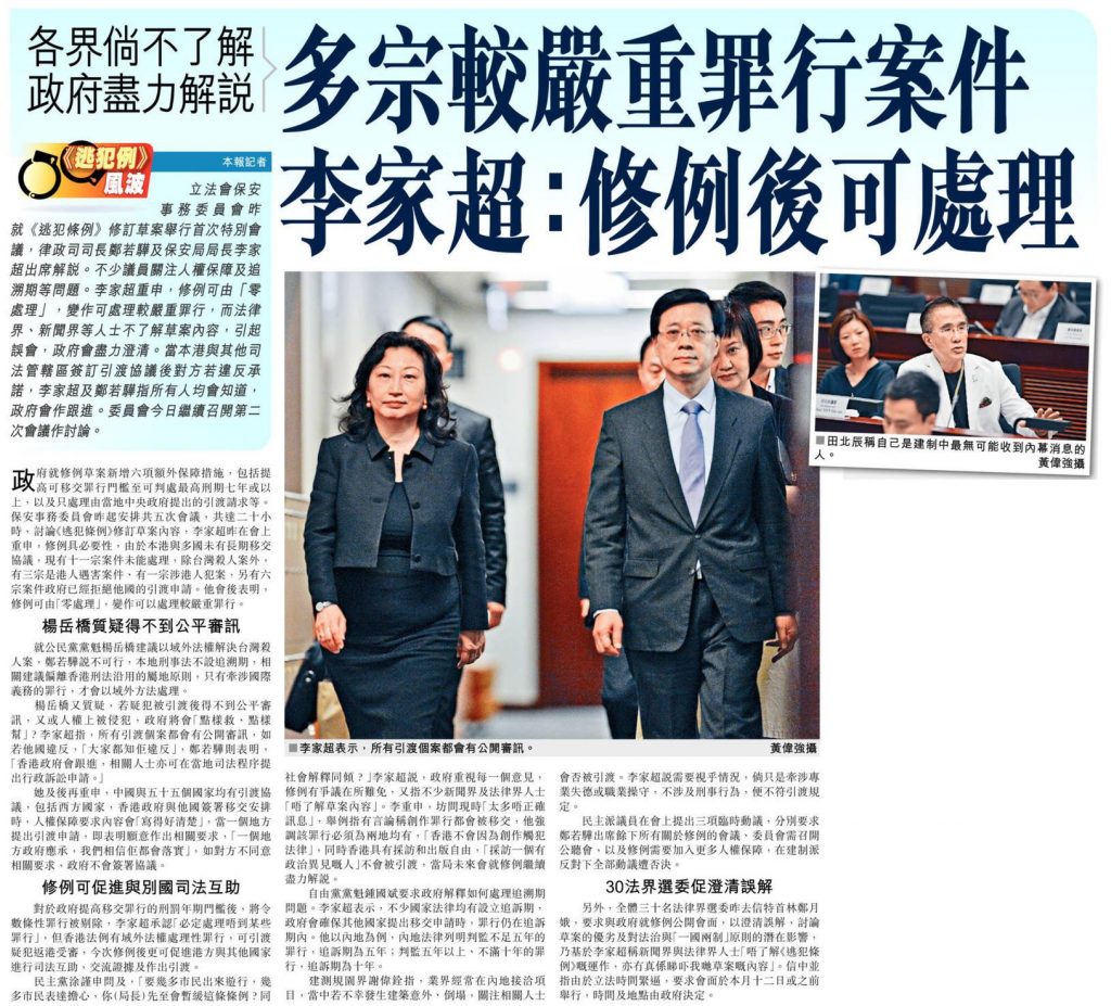 立法會保安事務委員會昨就《逃犯條例》修訂草案舉行首次特別會議,律政司司長鄭若驊及保安局局長李家超出席解說。不少議員關注人權保障及追溯期等問題。李家超重申,修例可由「零處理」,變作可處理較嚴重罪行,而法律界、新聞界等人士不了解草案內容,引起誤會,政府會盡力澄清。當本港與其他司法管轄區簽訂引渡協議後對方若違反承諾,李家超及鄭若驊指所有人均會知道,政府會作跟進。委員會今日繼續召開第二次會議作討論。