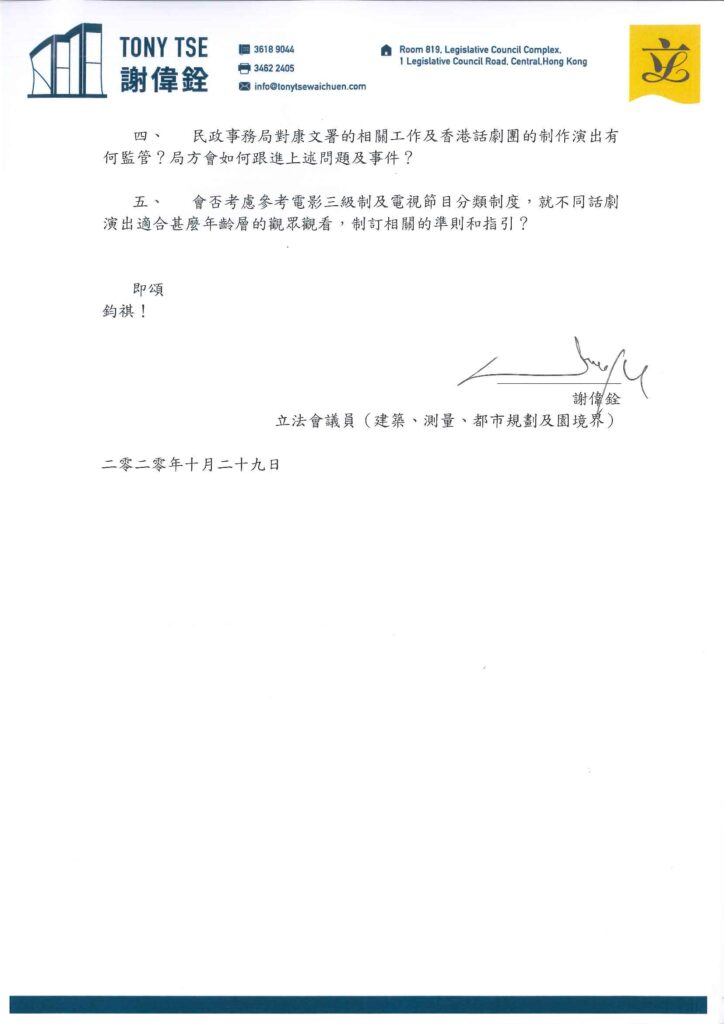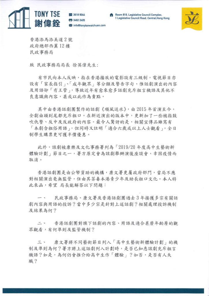 [:zh]就話劇演出內容的監管 致函民政事務局局長[:]