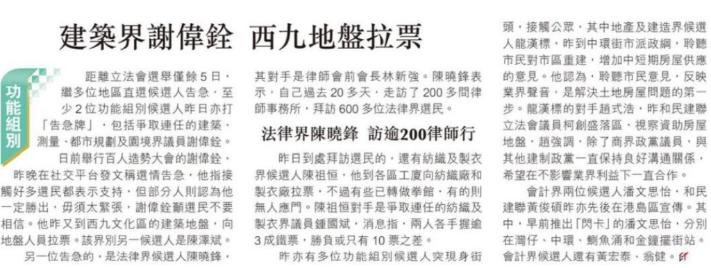 距離立法會選舉僅餘5日,繼多位地區直選候選人告急,至少2位功能組別候選人昨日亦打「告急牌」,包括爭取連任的建築、測量、都市規劃及園境界議員謝偉銓。