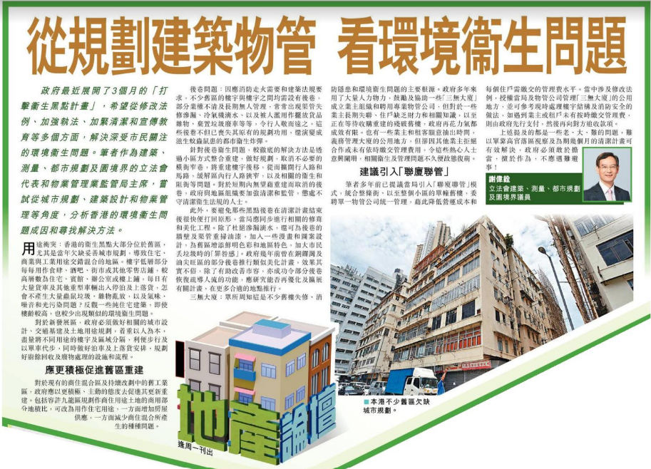 政府最近展開了3個月的「打擊衞生黑點計畫」,希望從修改法例、加強執法、加緊清潔和宣傳教育等多個方面,解決深受市民關注的環境衞生問題。筆者作為建築、測量、都市規劃及園境界的立法會代表和物業管理業監管局主席,嘗試從城市規劃、建築設計和物業管理等角度,分析香港的環境衞生問題成因和尋找解決方法。