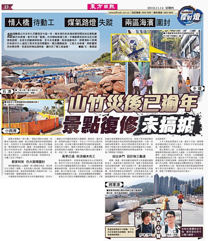 [:zh]超強颱風山竹去年九月襲港至今逾一年,惟本港仍有多個休憩空間及知名景點建築仍未修復。當中石澳「藍橋」仍未開始修復工程