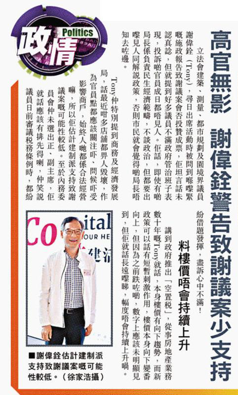 [:zh]立法會建築、測量、都市規劃及園境界議員謝偉銓(Tony),尋日出席活動時被問到喺嚟緊嘅施政報告致謝議案會否投贊成票,佢