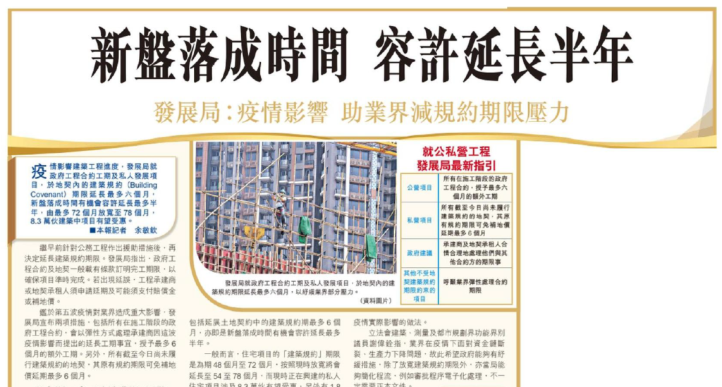 疫情影響建築工程進度,發展局就政府工程合約工期及私人發展項目,於地契內的建築規約(Building Covenant)期限延長最多六個月,新盤落成時間有機會容許延長最多半年,由最多72個月放寬至78個月,8.3萬伙建築中項目有望受惠。