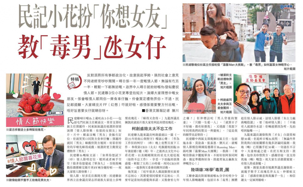 民建聯噚日喺fb上載咗由3小花──包括屯門社區主任賴嘉汶、葵青支部社區主任鄧麗玲,同東區區議員植潔鈴深情演繹「情人節快樂:你想的女朋友」短片。片中,賴嘉汶嘅「男友」食飯冇訂位,佢就笑笑口同對方食車仔麵;鄧麗玲就同「男友」睇戲但對方遲到,好彩佢特登約早啲先睇得成戲;植潔鈴更主動買定禮物畀「男友」。