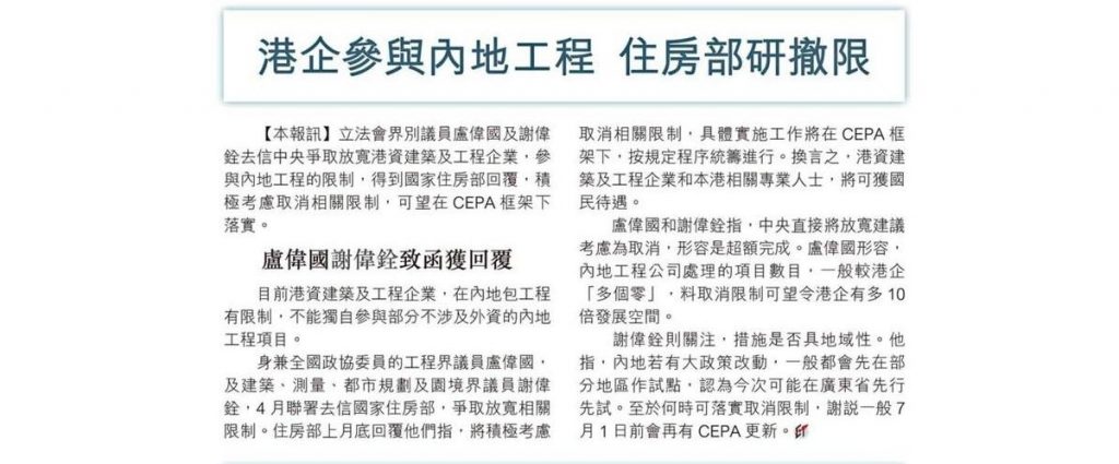 [:zh]立法會界別議員盧偉國及謝偉銓去信中央爭取放寬港資建築及工程企業,參與內地工程的限制,得到國家住房部回覆,積極考慮取消相關限制,可望在CEPA框架下落實。