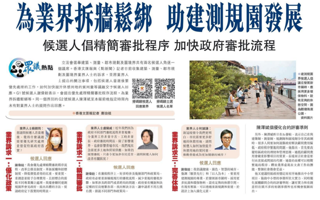 立法會選舉建築、測量、都市規劃及園境界共有兩名候選人角逐一個議席。香港文匯報與《點新聞》記者日前收集建築、測量、都市規劃及園境界業界人士的訴求,並將業界人士提出的關注事項,包括候選人當選後要優先處理的工作,如何加快提升休憩用地的質同量等議題交予候選人回應。G1號候選人謝偉銓表示,會提出優先處理精簡審批程序流程,為業界拆牆鬆綁等。同一個界別的G2號候選人陳澤斌至本報前晚指定時限內未有對業界人士的提問作出回應。