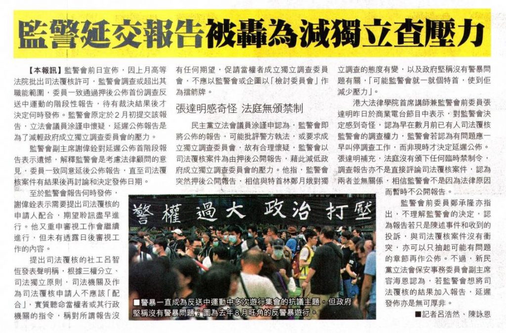 [:zh]【本報訊】監警會前日宣佈,因上月高等法院批出司法覆核許可,監警會調查或超出其職能範圍,委員一致通過押後公佈首份調查