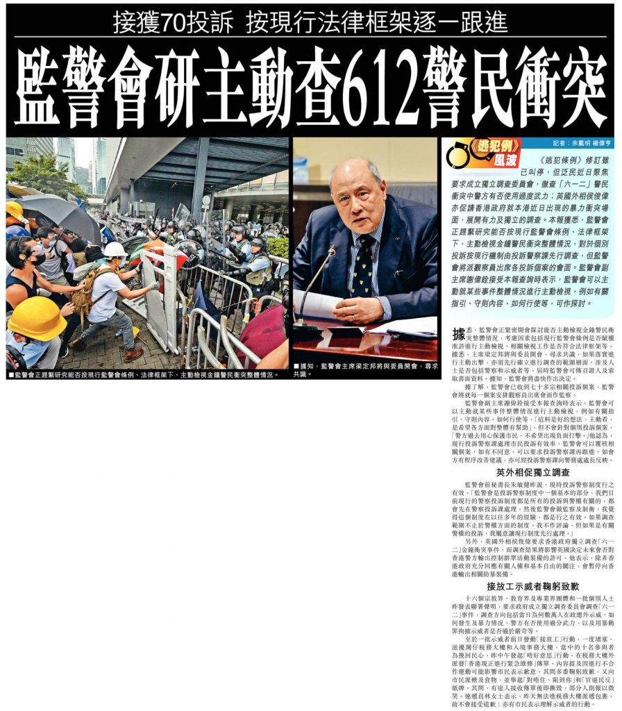 國外相侯俊偉亦促請香港政府就本港近日出現的暴力衝突場面,展開有力及獨立的調查。本報獲悉,監警會正趕緊研究能否按現行