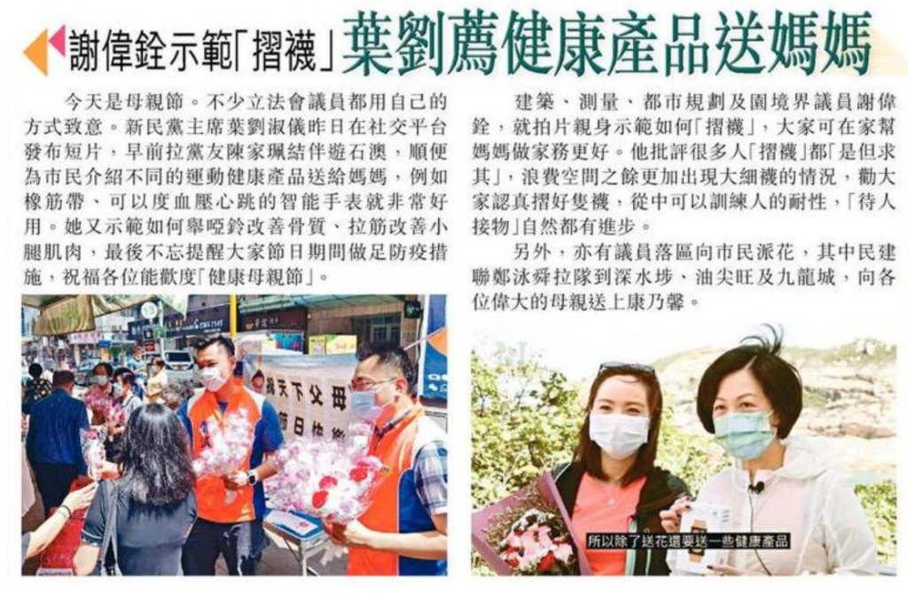 另外,亦有議員落區向市民派花,其中民建聯鄭泳舜拉隊到深水埗、油尖旺及九龍城,向各位偉大的母親送上康乃馨。