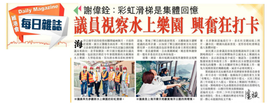 海洋公園早前因疫情而關閉逾兩個月,日前終於重開,園方正籌備全面改革,明日便會在立法會經濟發展委員會中再次討論公園的擬議未來路向,並爭取撥款。昨日園方邀請多位議員入園參觀,包括預計將於今年暑假開幕的大樹灣新水上樂園,大型造浪池、室內滑水梯及彩虹滑梯等設施,實地了解公園的最新情況,又聽取園方講解建議的改革計畫,以加深了解公園的發展方向及財務安排。出席的議員包括事務委員會主席經民聯張華峰、委員盧偉國、自由黨鍾國斌、姚思榮和謝偉銓,還有非委員田北辰和容海恩。