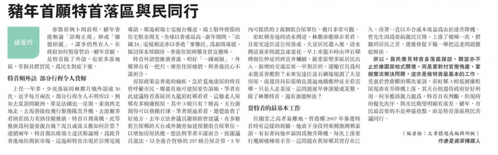 所以,居民樂見特首多落區探訪,期望亦不止於維園派桔式關懷,而是要對付官僚惰庸、掌握實况解決問題,這亦是做特首最基本的工作。受惠於曾蔭權的那次家訪,彩虹邨3 幢低層廉租屋現亦有升降機上落,其天台則還待政府好好利用。何事應該親力親為,特首自有判斷,但現時的優先次序,與市民期望明顯有落差。豬年,市民最需要的不是神靈指點,而是特首落區與民共議同行。