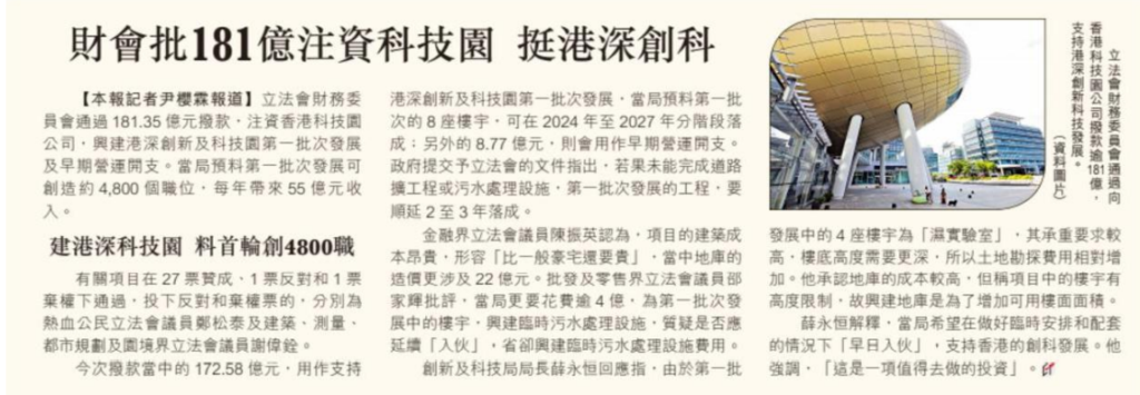 立法會財務委員會通過181.35億元撥款,注資香港科技園公司,興建港深創新及科技園第一批次發展及早期營運開支。當局預料第一批次發展可創造約4,800個職位,每年帶來55億元收入。