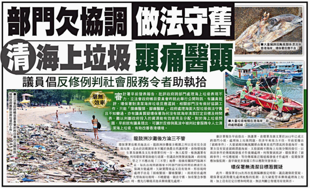 審計署早前發表報告,批評政府跨部門處理海上垃圾表現不力,立法會政府帳目委員會昨就此舉行公開聆訊,有議員批評,環保署對清潔海岸垃圾反應遲鈍,相關部門沒有做好協調工作,只能「頭痛醫頭、腳痛醫腳」,政府處理海面大型垃圾做法守舊且不知變通。亦有議員質疑環保署為何沒有就海岸清潔訂定目標及時間表,難以判斷政府投入的資源能有效使用及分配。對於海上垃圾問題,早前就有議員提出,可讓於反修例風波中被判社會服務令人士清潔海上垃圾,有助改善香港環境。