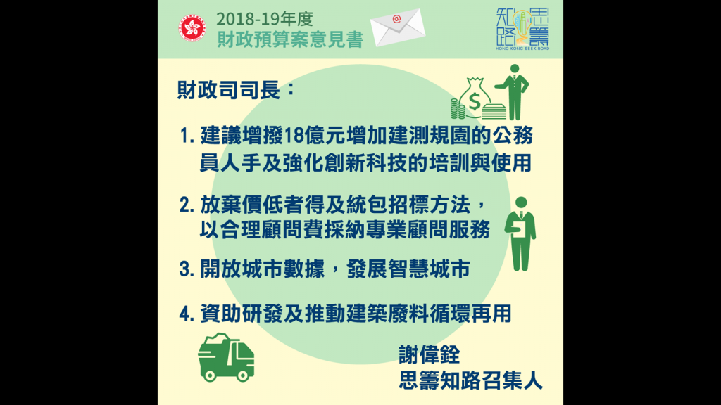[:zh]2018 – 2019年度財政預算案意見書[:en]2018-2019年度財政預算案意見書[:] / 2018 / 作者: root [:zh]財政預算案正在諮詢公眾,思籌知路與我收集了業界唔少朋友既意見,寫左一份意見書發左俾財政司司長陳茂波,希望政府能夠增撥資源予建測規園的公務員喇! [:]