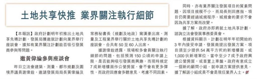 據了解,政府亦即將就土地共享計劃,諮詢立法會發展事務委員會。