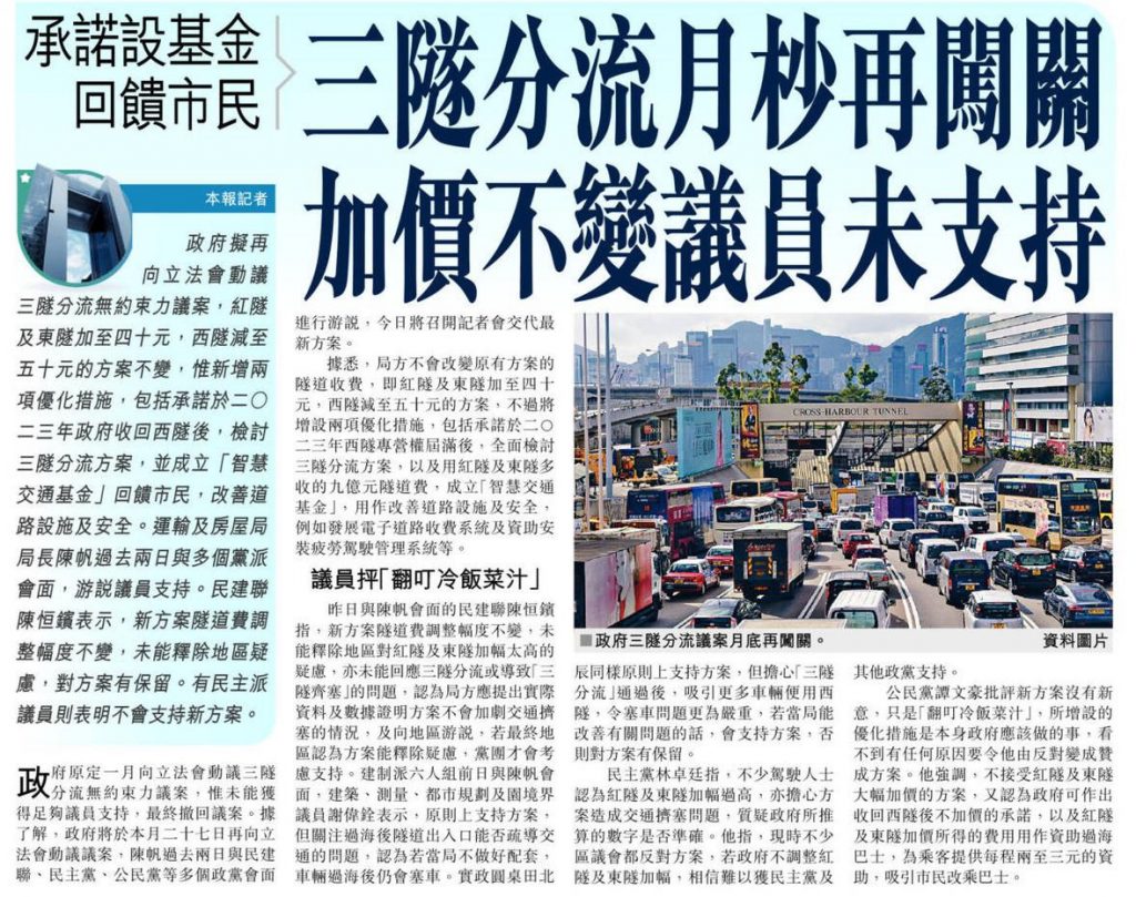 [:zh]政府擬再向立法會動議三隧分流無約束力議案,紅隧及東隧加至四十元,西隧減至五十元的方案不變,惟新增兩項