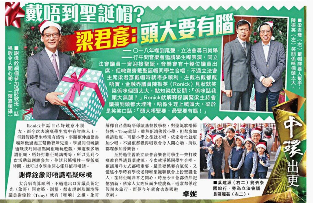 [:zh] 二○一八年嚟到尾聲,立法會尋日就舉行午間音樂會邀請學生嚟表演,同立法會議員一齊迎接聖誕。音樂會有十