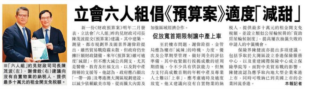 香港文匯報訊(記者 馬壯)立法會議員謝偉銓和陳健波昨日與其他「G6」成員一同會見財政司司長陳茂波,就新年度預算案提供建議,包括協助有意到大灣區創業、就業、就學或居住的港人,加快「明日大嶼願景」和覓地建屋,成立保險學院,預留資源創造就業機會等。